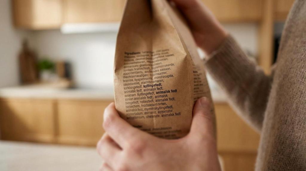 Når du vil være konsekvent, så scan ingredienslisten for ord som “kylling”, “fjerkræ”, “poultry”, “animal fat” (hvis ikke specificeret), og hold øje med om proteinkilden er tydeligt navngivet.